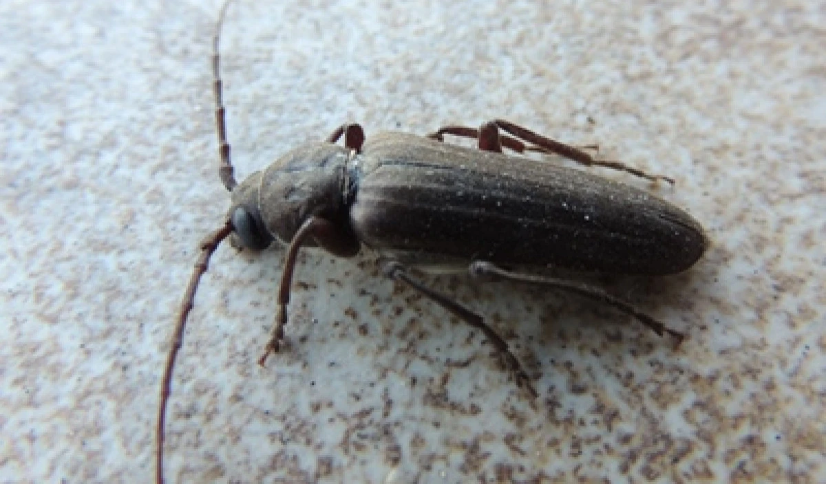 Burnt Pine Beetle is a member of the longhorn group of beetles that tend to be elongate and with long antennae. They commonly fly into homes and other buildings from close by pine trees or fire wood. Their large size can be of concern to people.