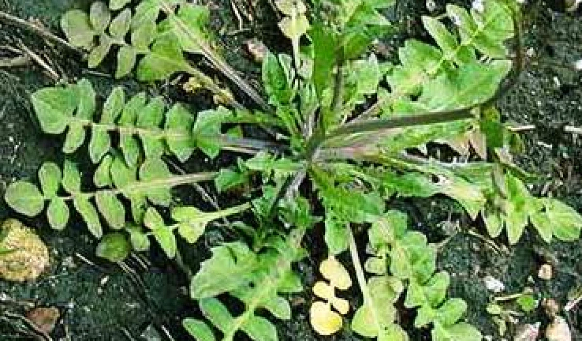 Shepherd's purse is a rosette forming rapidly growing annual weed. It has characteristic lobed leaves and flowering stems that grow up to 30 cm from the middle of the rosette. The flowers are small and white.