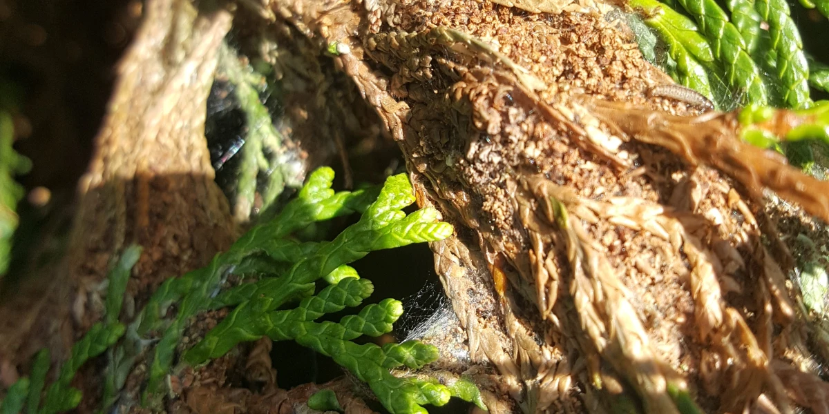 Are you finding bits of your conifer trees dying back and inside there are strange clumps of detritus among the branches? If you open the clumps you will find that they contain caterpillars that are munching on your conifer and killing the tips causing browning off and dieback. There may also be white fungal hyphae where the detritus is beginning to decay. The clumps of dead and live foliage, frass (faeces) and other material are held together by silk webbing produced by the caterpillars. The caterpillars feed on the live and dead foliage.
