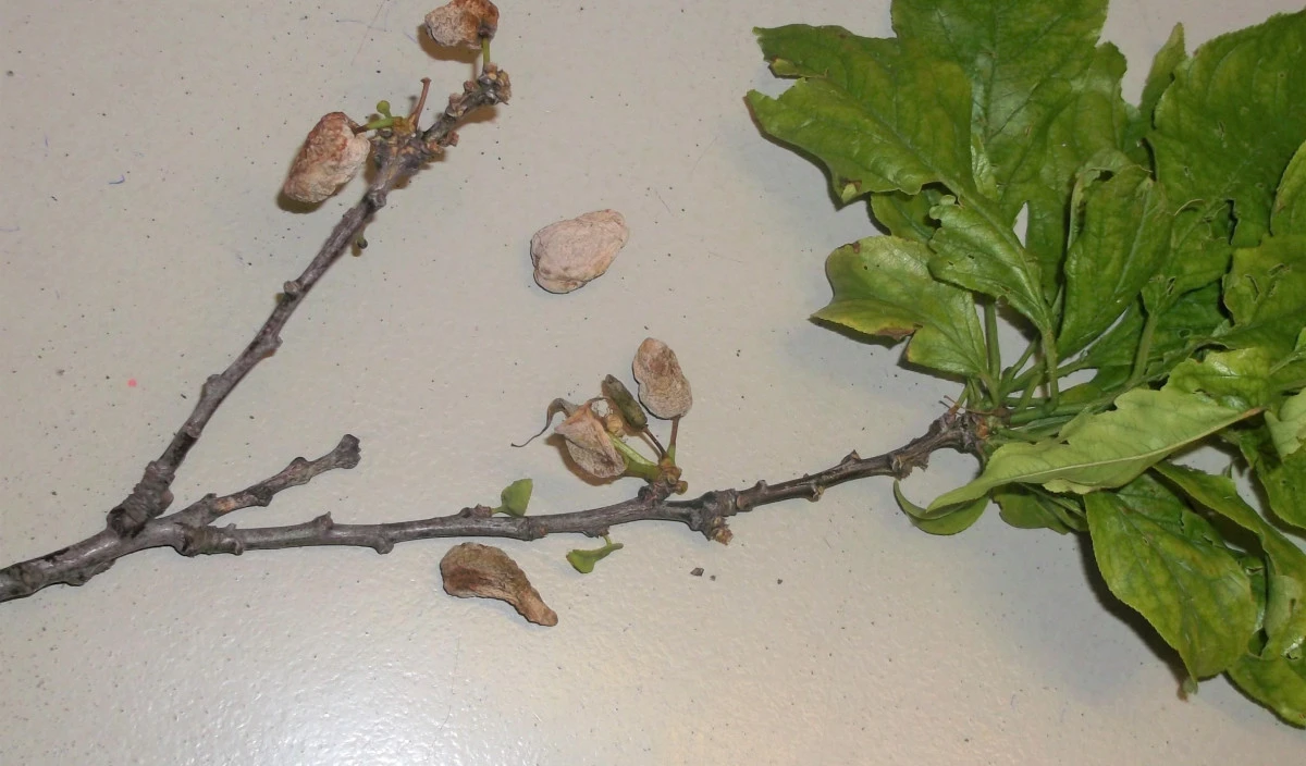 Bladder plum infection starts with a small blister on the fruit. The blister quickly grows and soon covers the whole fruit and they may grow to ten times their normal size. The fruit goes white/grey, gets a spongy texture and becomes covered with velvety, gray fungal spores. Eventually infected fruit dry out and turn black.
