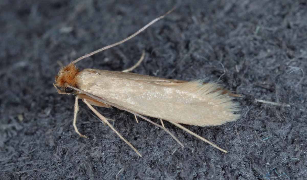 Clothes moths are small (about 1 cm), buff-coloured moths. Two different species are common in New Zealand, the webbing clothes moth and the case making clothes moth. The webbing clothes moth is uniformly buff-coloured, whereas the case making clothes moth is similar in appearance but has indistinct dark specks on the wings.