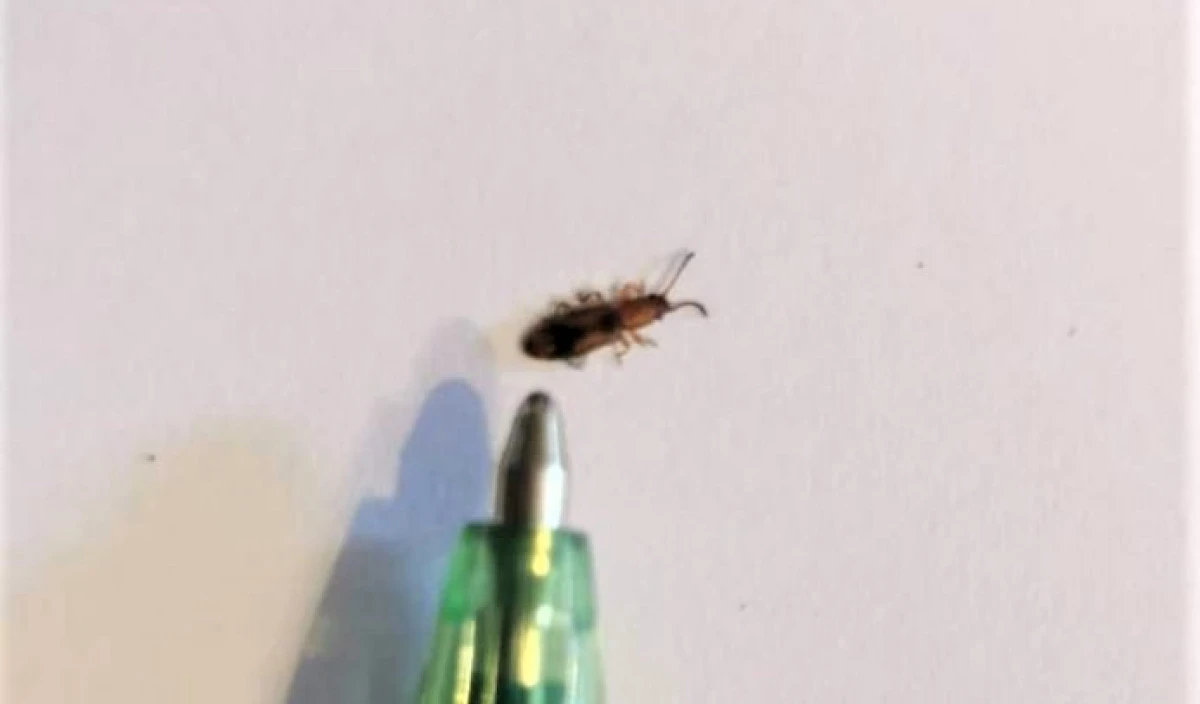 Desjardin's beetle are small (4-5 mm) elongated brown and black beetles found feeding on moulds growing on plants such as flax and palms. The nymph of the beetle are a little smaller, pale, lack the elytra and wings of the adult with clearly segmented thorax and abdomen.