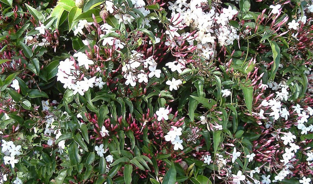 Jasmine is an evergreen rampant, spreading, climbing perennial vine. It has fragrant white flowers in large showy groups.