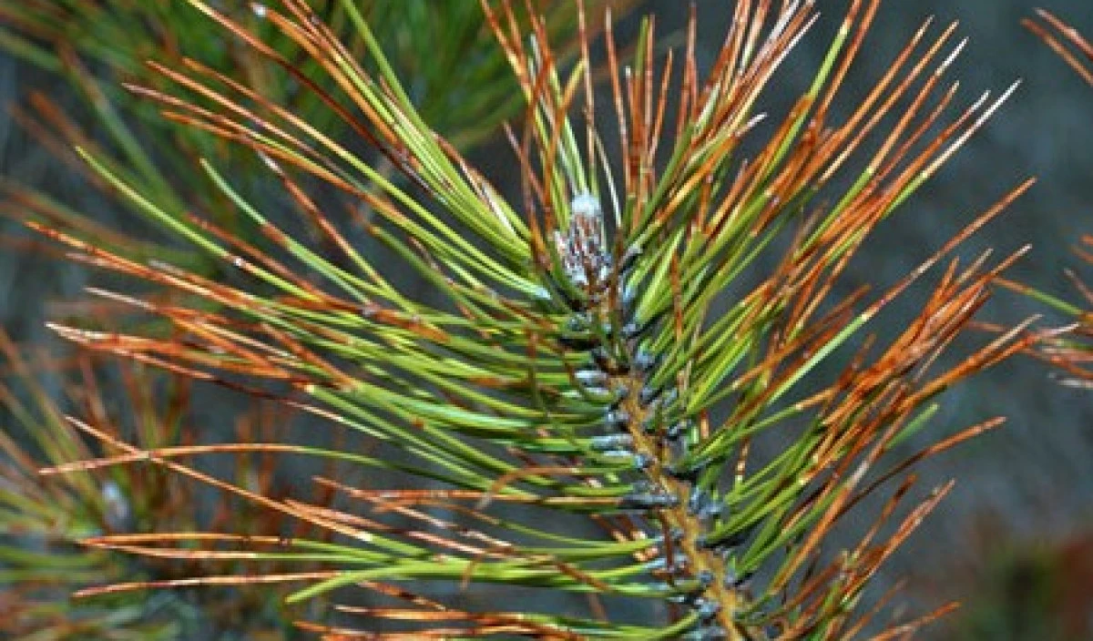 The tip of the needle beyond the band eventually dies leaving the base of the needle alive and green. Young trees are more likely to suffer damage than older trees.