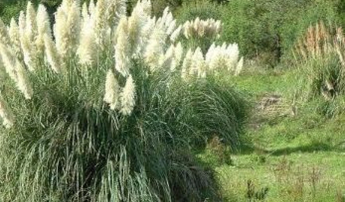 Pampas grass is a very large clumping grass with long feathery seed heads that looks similar to the smaller native toetoe (aka Toitoi and Toi toi). Dead leaf bases spiral like wood shavings. Erect, fluffy, white-pinkish seed heads are produced from summer to autumn which fade to a dirty cream as seed forms.