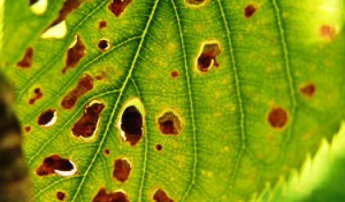 Shot hole is a symptom of fungal or bacterial disease of stone fruit and other plants causing small spots and holes in leaves.
