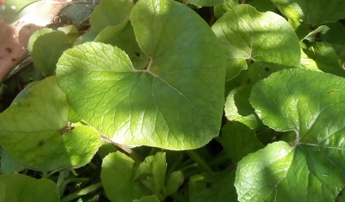 Winter heliotrope has large kidney shaped lower leaves. When flowering it produces a tall thistle-like stem of pink flowers.